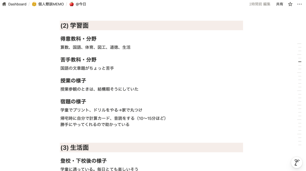 参考までに、私が「個人懇談メモ」に入れている項目をご紹介します。